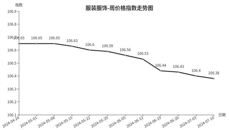 本周,服装服饰类周价格指数收于106.38点,环比下跌0.02点。从二级分类看,服装类和服饰类均出现下跌,分别下跌0.03点和0.02点,是导致周价格指数下跌的主要原因。