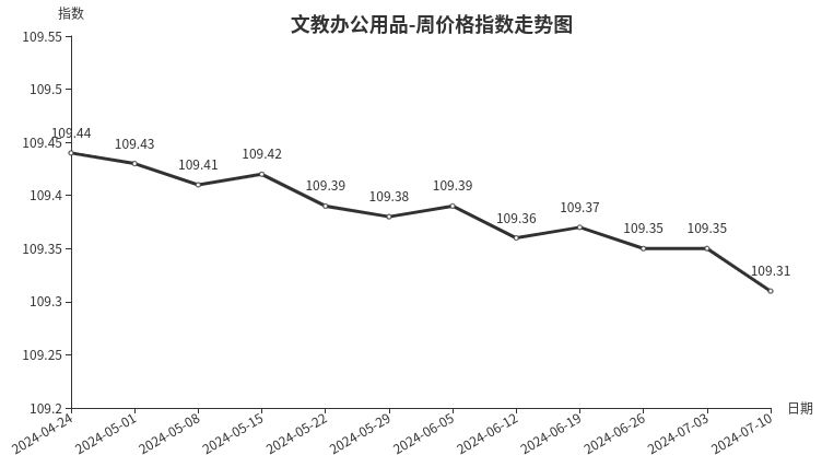 本周,文教办公用品类周价格指数收于109.31点,环比下跌0.04点,跌幅0.04%。从指数构成要素看,文化办公用品周价格指数下跌0.07点;体育娱乐用品周价格指数微涨0.01点。