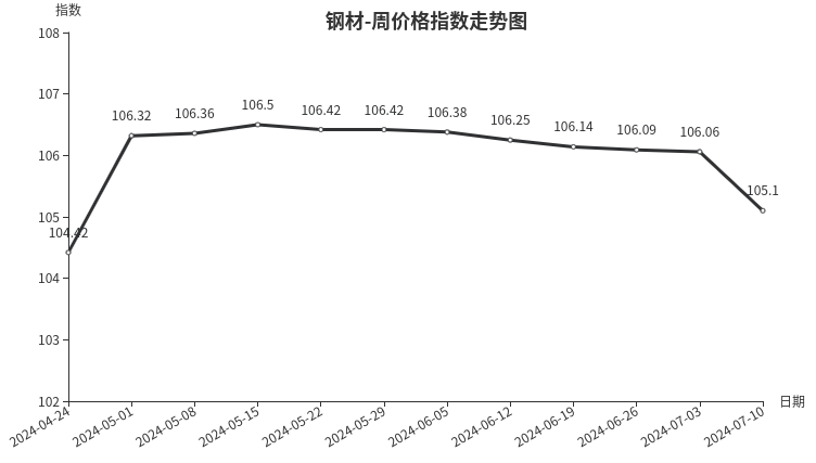 本周,钢材类周价格指数收于105.10点,环比下跌0.96点,跌幅0.91%。从盘面看,三级分类全部下跌,其中型材类、建筑钢材类、板材类、管材类指数分别下跌1.30点、1.26点、1.05点和0.75点。