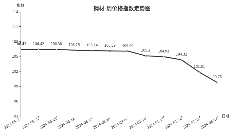 本周,钢材类周价格指数收于99.75点,环比下跌2.06点,跌幅2.02%。从盘面看,三级分类全部出现下跌,其中型材类、建筑钢材类、板材类、管材类指数分别下跌2.74点、2.65点、2.32点和1.65点。