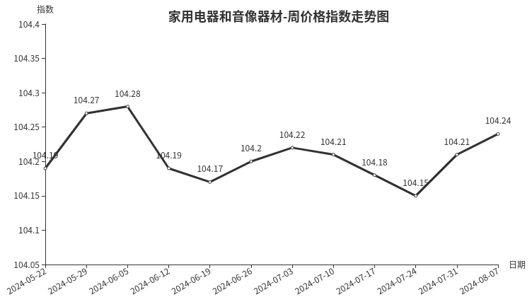 本周,家用电器和音像器材类周价格指数收于104.24点,环比上涨0.03点,涨幅0.03%。从指数构成要素看,净化电器、电风扇、制冷电器、厨房电器分别上涨0.26、0.20、0.10、0.05点;个人生活电器、热水器、家居电器分别下跌0.13、0.10、0.03点。