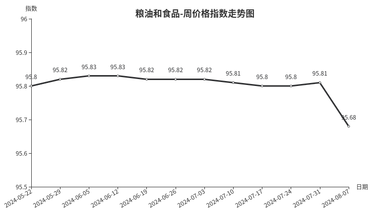 本周,粮油和食品类周价格指数收于95.68点,环比下跌0.13点,跌幅0.14%。从盘面看,只有副食类上涨0.12点,其他分类如粮油类、茶叶类、调味品类和干果类指数均出现下跌,分别下跌0.18点、0.09点、0.09点和0.02点,拉动指数整体下跌。