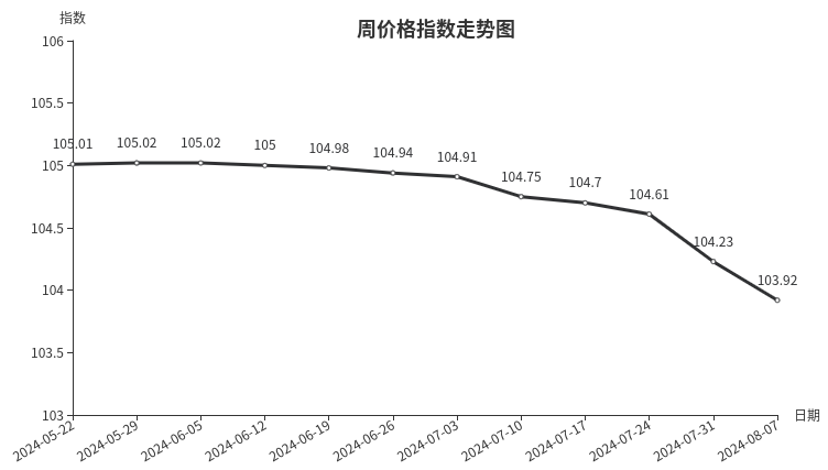 据临沂商城价格指数信息系统监测,本周临沂商城周价格总指数为103.92点,环比下跌0.31点,跌幅0.30%。
