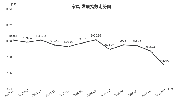 7月份,家具类发展指数收于996.95点,环比下跌1.78点,同比下跌3.14点。其中,发展规模指数、发展效益指数、发展信心指数环比均下跌,分别下跌1.36、1.89、2.39点。