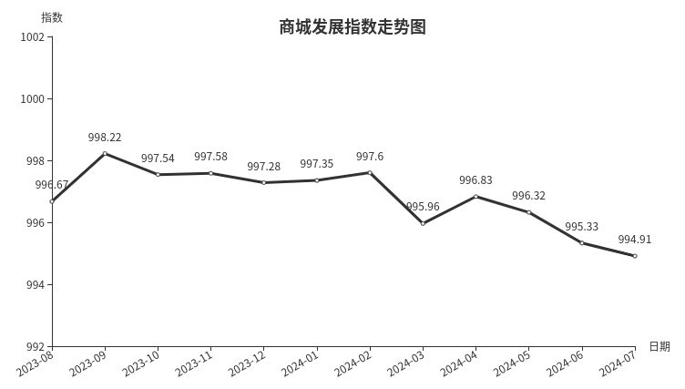 据临沂商城指数系统监测,7月份临沂商城发展指数收于994.91点,环比下跌0.41点,同比下跌1.63点。