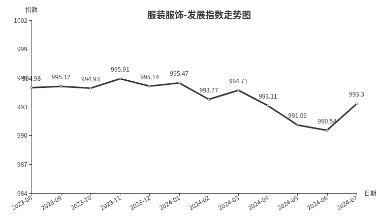 7月份,服装服饰类发展指数收于993.30点,环比上涨2.77点,同比下跌1.48点。