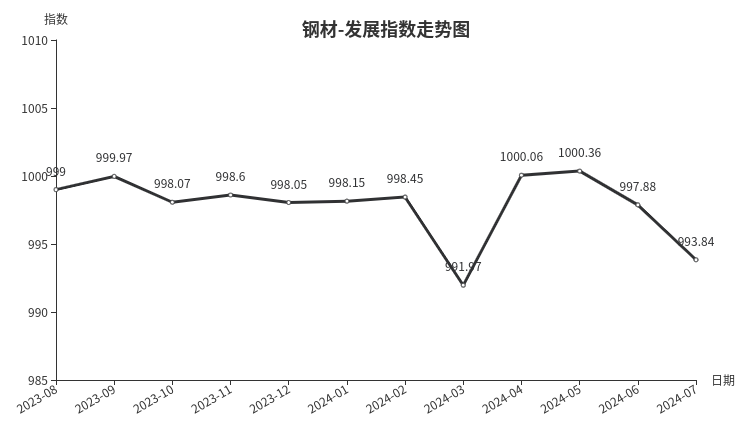 7月份,钢材类发展指数收于993.84点,环比下跌4.04点,同比下跌6.15点。其中发展规模指数、发展效益指数、发展信心指数环比均下跌,指数分别下跌3.74点、3.25点和6.19点。