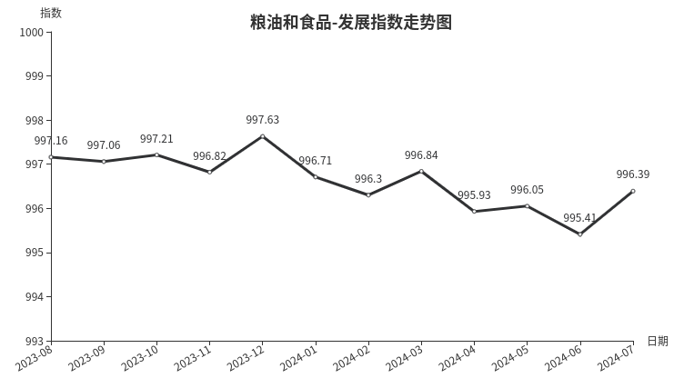 7月份粮油和食品类发展指数收于996.39点,环比上涨0.98点,同比下跌0.33点。其中,发展规模指数、发展效益指数和发展信心指数全部上涨,分别上涨0.91点、0.88点和1.33点。