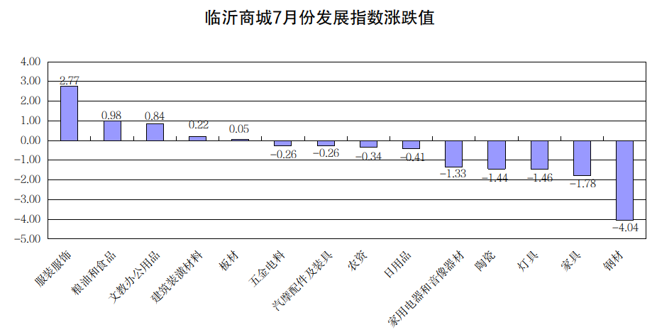 现将7月份发展指数涨跌幅较大和代表性较强的服装服饰、粮油和食品、家具、钢材等市场行情作简要分析。