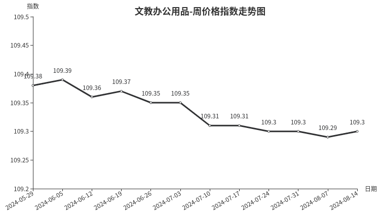 本周,文教办公用品类周价格指数收于109.30点,环比上涨0.01点。二级分类中,体育娱乐用品类上涨0.02点,文化办公用品类上涨0.01点。