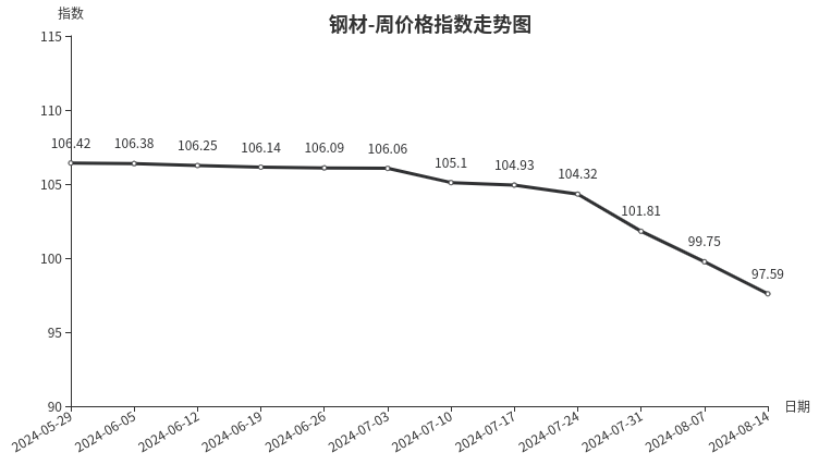 本周,钢材类周价格指数收于97.59点,环比下跌2.16点,跌幅2.17%。从盘面看,三级分类全部出现下跌,其中建筑钢材类、型材类、板材类、管材类指数分别下跌3.02点、2.71点、2.49点和1.70点。