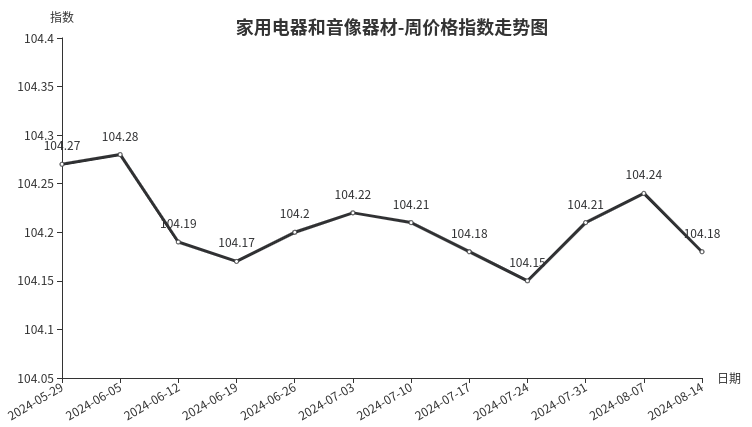 本周,家用电器和音像器材类周价格指数收于104.18点,环比下跌0.06点,跌幅0.06%。从指数构成要素看,厨房电器、电风扇分别下跌0.36、0.08点;个人生活电器、净化电器、制冷电器、热水器、音像器材分别上涨0.19、0.13、0.13、0.08、0.08点。