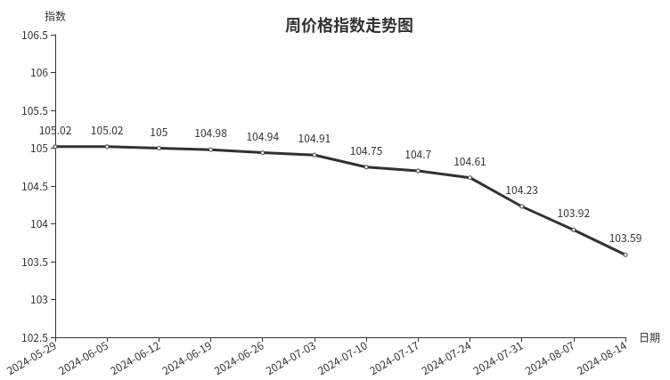 据临沂商城价格指数信息系统监测,本周临沂商城周价格总指数为103.59点,环比下跌0.33点,跌幅0.32%。