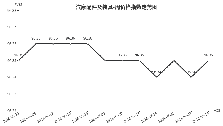 本周,汽摩配件及装具类周价格指数收于96.35点,环比上涨0.01点。二级分类中仅汽车配件上涨0.01点,主要是发动机系统指数上涨0.02点;摩托车配件、汽车装饰类价格较为稳定。