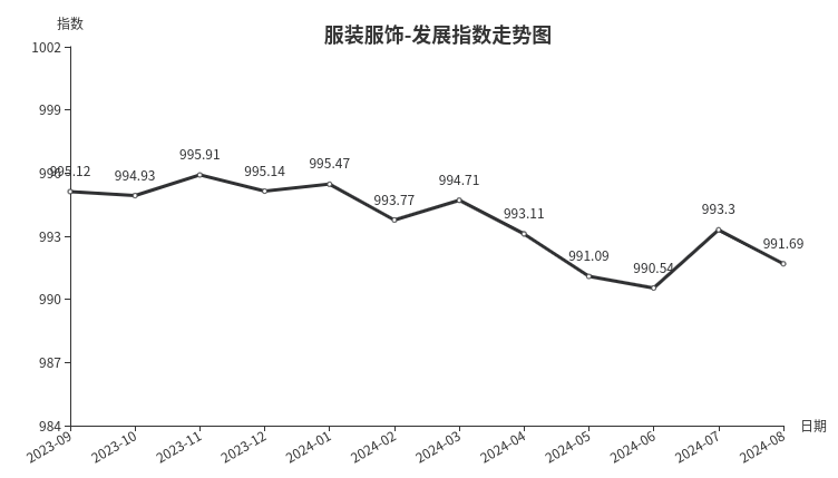 8月份处于市场淡季收尾阶段,行情偏弱,预计9月份服装服饰市场行情将迎来好转,秋分后气温下降,刺激秋装购买需求,预计后期指数看涨。
