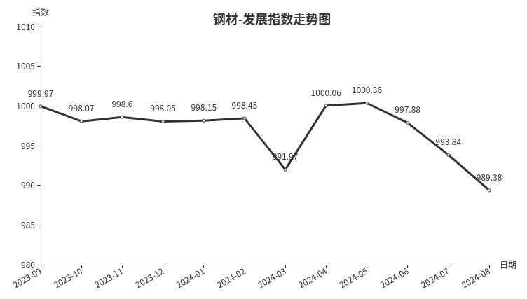 8月份,钢材类发展指数收于989.38点,环比下跌4.46点,同比下跌9.62点。其中发展规模指数、发展效益指数、发展信心指数环比均下跌,指数分别下跌1.79点、1.40点和15.93点。
