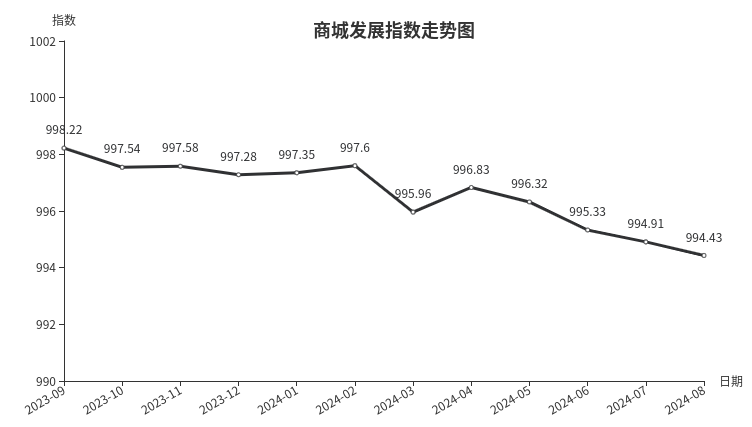 据临沂商城指数系统监测,8月份临沂商城发展指数收于994.43点,环比下跌0.49点,同比下跌2.24点。