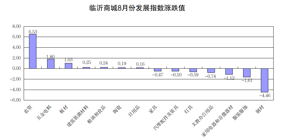 现将8月份发展指数涨跌幅较大和代表性较强的农资、五金电料、服装服饰、钢材等市场行情作简要分析。
