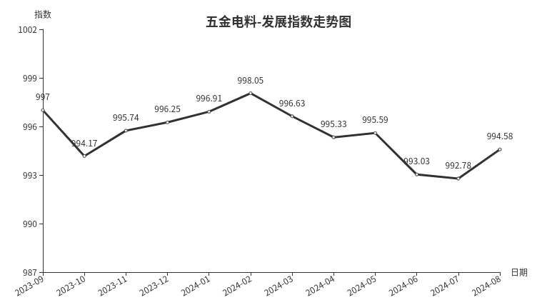 8月份,五金电料类发展指数收于994.58点,环比上涨1.80点,同比下跌0.50点。其中,发展规模指数、发展效益指数环比分别上涨1.86、2.94点,发展信心指数下跌0.60点。