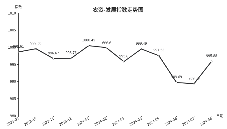 从发展指数构成来看,2024年8月份,发展规模指数收于995.21点,环比上涨0.03点,同比下跌1.62点;发展效益指数收于994.63点,环比上涨0.10点,同比下跌1.76点;发展信心指数收于992.46点,环比下跌2.69点,同比下跌4.46点。