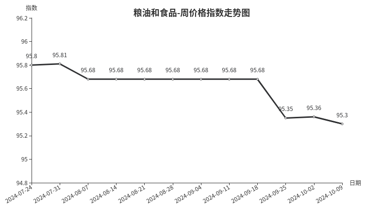 本周,粮油和食品类周价格指数收于95.30点,环比下跌0.06点,跌幅0.06%。从盘面看,粮油类下跌0.09点;调味品类、茶叶类和干果类分别上涨0.17点、0.14点和0.03点;副食类价格指数与上期持平。