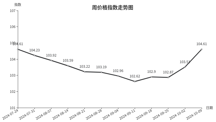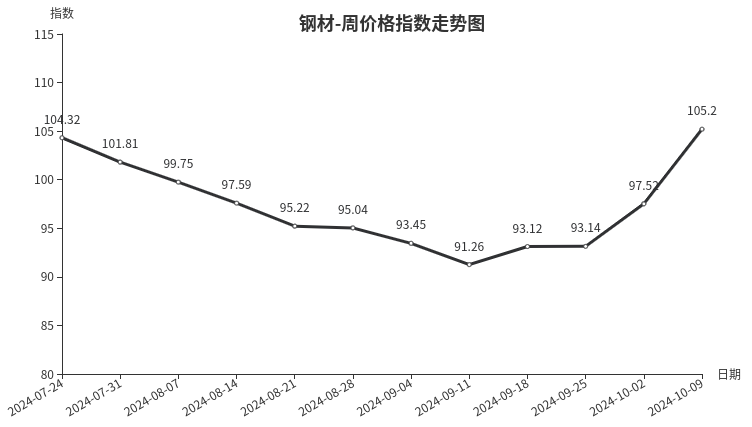 本周钢材类周价格指数继续上涨且涨幅增大。受国外降息以及降低房贷利率等一系列利好政策影响,钢材期货市场上涨明显,同时铁矿石、焦炭等原材料价格同步上涨,带动市场钢材价格走高。但价格上涨过快幅度过大,市场对后市多持谨慎观望态度,不敢大批量出货,市场整体存储量、销售量未见明显增长。从市场具体规格品看,直径35mm热轧圆钢价格4011元/吨,上涨14.09%;直径14mm线材价格3635元/吨,上涨13.87%;5.75mm薄钢板价格3685元/吨,上涨13.66%;350mm*175mm H钢价格3785元/吨,上涨13.25%;48mm无缝钢管价格4135元/吨,上涨11.99%;40mm*60mm方管价格4285元/吨,上涨11.52%。