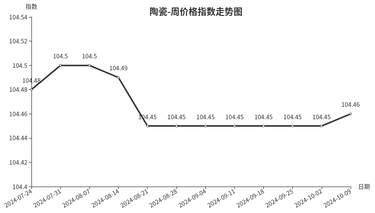 本周,陶瓷类周价格指数收于104.46点,环比上涨0.01点,涨幅0.01%。从指数构成要素看,日用陶瓷、陶瓷洁具、建筑陶瓷周价格指数均小幅上涨,分别上涨0.03点、0.03点、0.01点。