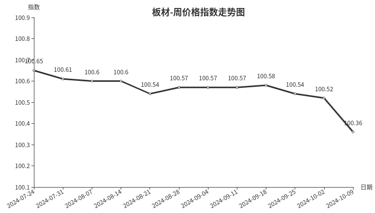 本周,板材类周价格指数收于100.36点,环比下跌0.16点,跌幅0.16%。从指数构成要素看,周转板材、材料板材周价格指数均小幅下跌,分别下跌0.65点、0.05点,跌幅分别为0.64%、0.05%。