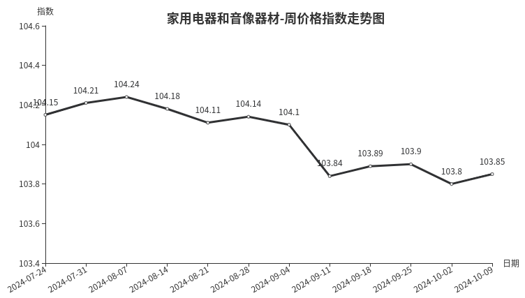 本周,家用电器和音像器材类周价格指数收于103.85点,环比上涨0.05点,涨幅0.05%。从指数构成要素看,制冷电器、厨房电器、音像器材、净化电器、热水器分别上涨0.17、0.16、0.08、0.06、0.01点;仅个人生活电器下跌0.20点。