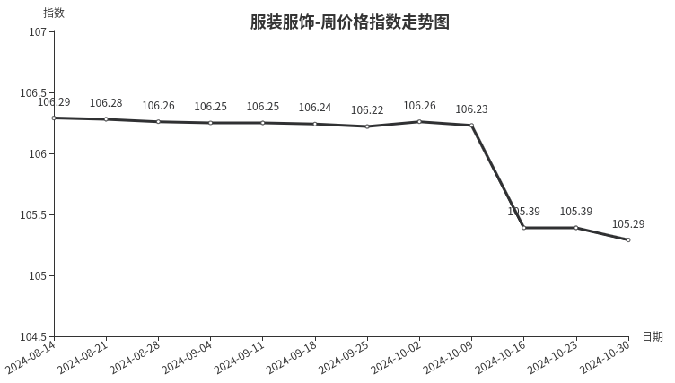 本周,服装服饰类周价格指数收于105.29点,环比下跌0.10点。从二级分类看,服饰类下跌0.55点,服饰类上涨0.09点,服装类指数下跌较多,拉动总指数下跌。