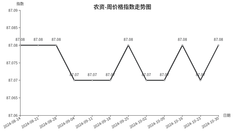 本周,农资类周价格指数收于87.08点,环比上涨0.01点。从二级分类看,兽禽用药类、农药类、种子类价格均出现上涨,分别涨0.55点、0.28点、0.09点,农膜类价格指数与上期持平。