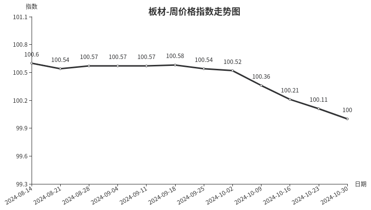 本周,板材类周价格指数收于100.00点,环比下跌0.11点,跌幅0.11%。从指数构成要素看,材料板材、周转板材周价格指数均小幅下跌,分别下跌0.12点、0.03点,跌幅分别为0.12%、0.03%。