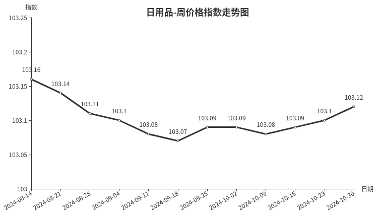 本周,日用品类周价格指数收于103.12点,环比上涨0.02点,涨幅0.02%。从二级分类看,箱包、护理及美容用品、玩具、首饰周价格指数出现小幅上涨,分别上涨0.47点、0.19点、0.06点、0.04点;针纺织品周价格指数下跌0.07点。