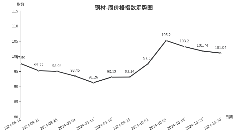 本周,钢材类周价格指数收于101.04点,环比下跌0.70点,跌幅0.69%。从盘面看,三级分类全部出现下跌,其中型材类、建筑钢材类、管材类、板材类指数分别下跌1.03点、0.92点、0.58点和0.54点。