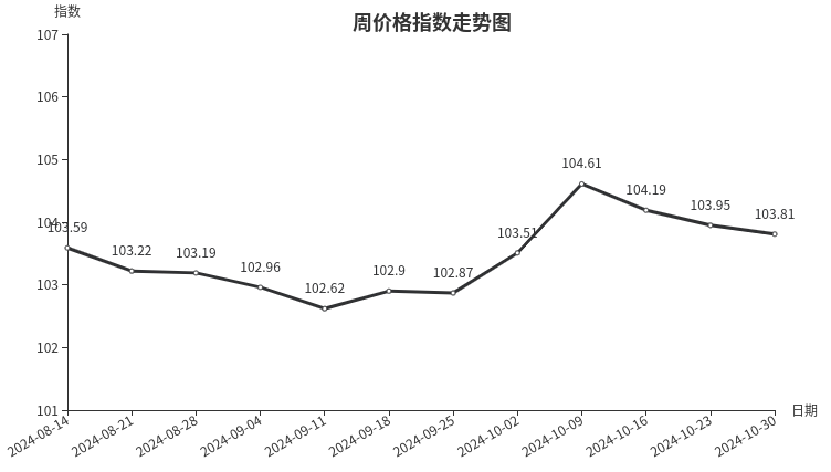 随着季节转换气温逐步降低,日用品类产品市场需求释放,外加电商平台“双11”活动陆续开展,部分箱包、护肤品、玩具等产品销量不断走高,市场供应链较为紧张,部分产品价格小幅上调,带动本周日用品类周价格指数小幅上涨。从具体规格品看,佳3385#书包本周价格为230.00元/个,价格环比上涨4.55%;英皇PC827-28拉杆箱本周均价为530.00元/个,价格环比上涨3.92%;中号小黄鸭本周均价为27.50元/个,价格环比上涨1.85%;芭宝丽香水10g本周均价为12.50元/瓶,价格环比上涨1.71%。