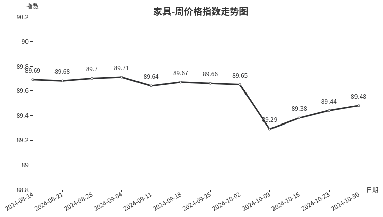 本周,家具类周价格指数收于89.48点,环比上涨0.04点。二级分类看,床及用品类价格持续回升0.21点,坐具类、桌类价格平稳回升0.04、0.01点;柜类价格小幅下跌0.06点。