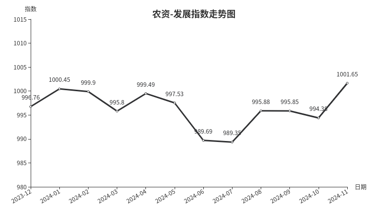 11月份,农资类发展指数收于1001.65点,环比上涨7.27点,涨幅0.73%;同比上涨4.98点,涨幅0.50%。