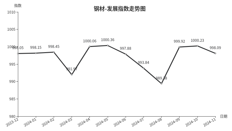 11月份,钢材类发展指数收于998.09点,环比下跌2.15点,同比下跌0.51点。其中发展规模指数、发展效益指数环比下跌,指数分别下跌3.40点和1.97点,发展信心指数与上月持平。