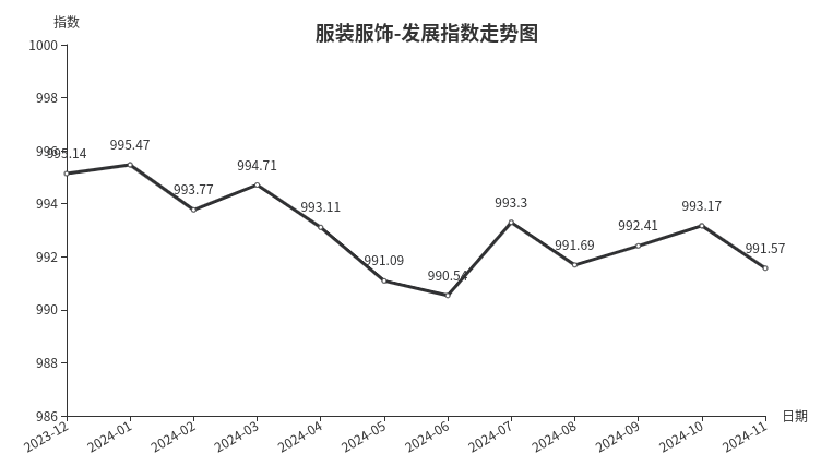 11月份,服装服饰类发展指数收于991.57点,环比下跌1.61点,同比下跌4.34点。其中,发展规模指数、发展效益指数和发展信心指数均出现下跌,分别下跌1.78点、1.65点和1.16点。