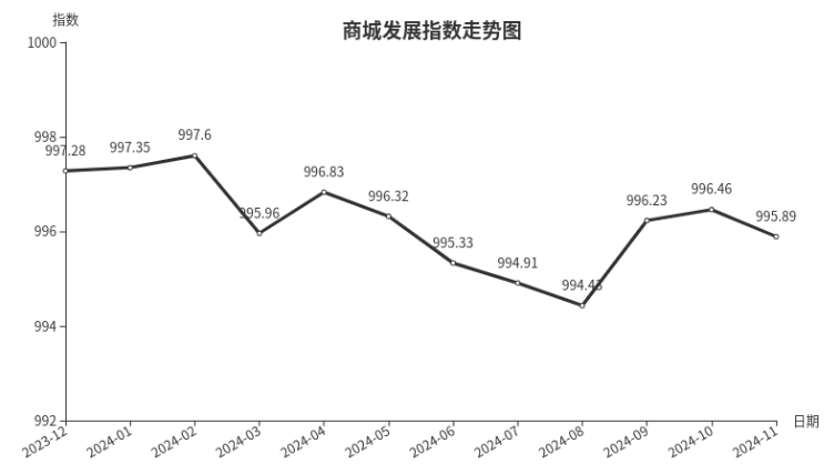 据临沂商城指数系统监测,11月份临沂商城发展指数收于995.89点,环比下跌0.57点,同比下跌1.69点。