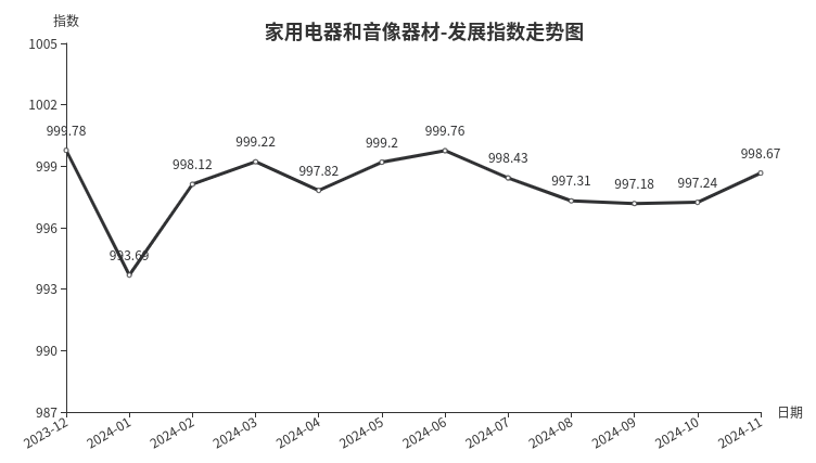 11月份,家用电器和音像器材类发展指数收于998.67点,环比上涨1.42点,同比下跌2.24点。其中,发展规模指数、发展效益指数、发展信心指数均实现上涨,分别上涨2.00、1.38、0.35点。