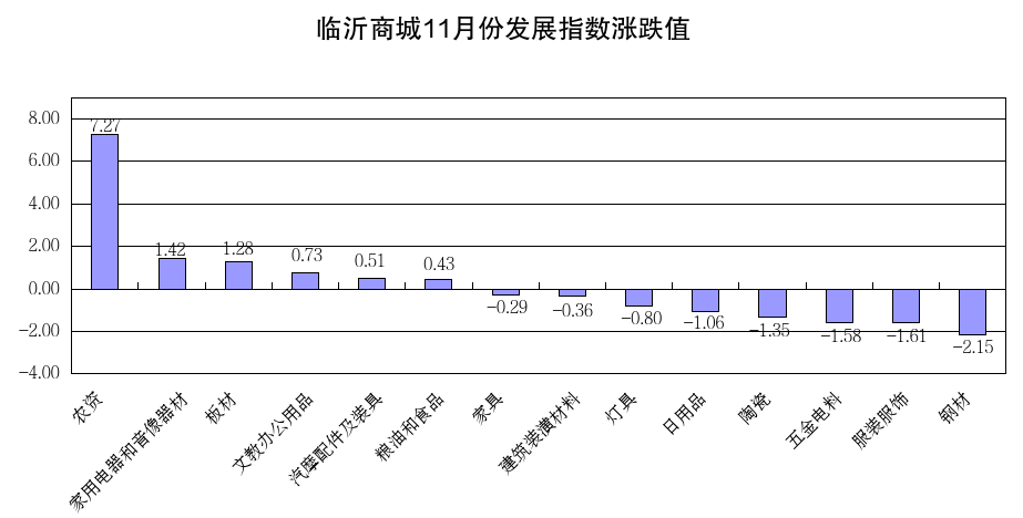 现将11月份发展指数涨跌幅较大和代表性较强的农资、家用电器和音像器材、服装服饰、钢材等市场行情作简要分析。