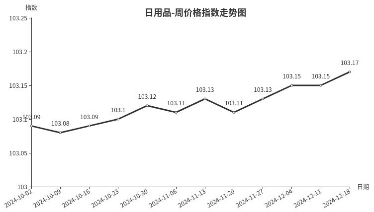 本周,日用品类周价格指数收于103.17点,环比上涨0.02点,涨幅0.02%。从盘面看,箱包、首饰、玩具、辅料和包装、针/纺织品分别上涨0.46、0.07、0.06、0.02、0.02点;护理及美容用品、工艺品、卫生清洁日用品分别下跌0.06、0.04、0.01点。