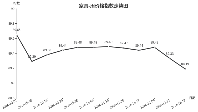 本周,家具类周价格指数收于89.19点,环比下跌0.14点。二级分类看,床及用品类、柜类、桌类和坐具类指数分别下跌0.48点、0.09点、0.06点和0.02点;架类价格指数与上期持平。