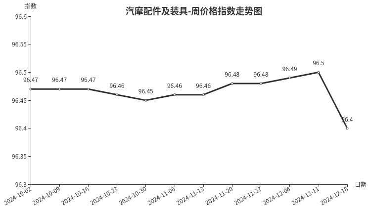 本周,汽摩配件及装具类周价格指数收于96.40点,环比下跌0.10点,跌幅0.10%。从盘面看,二级分类中主要是汽车配件价格回落,环比下跌0.15点,其中车身系统配件、电气设备配件分别下跌0.95、0.04点。