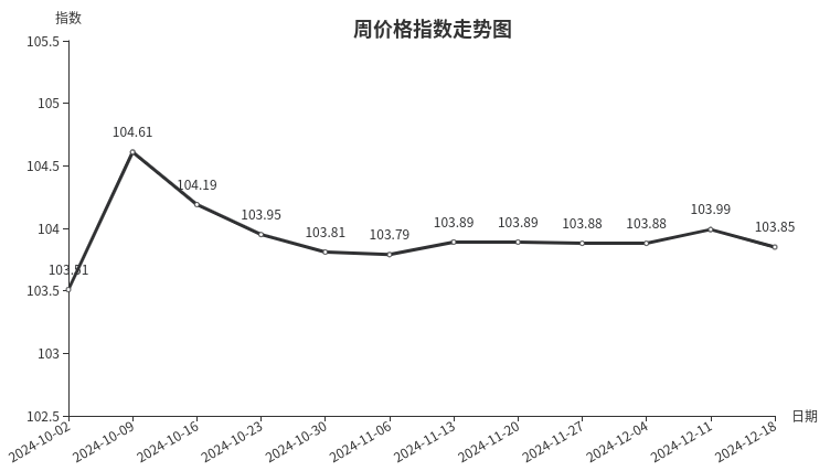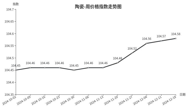 本周,陶瓷类周价格指数收于104.58点,环比上涨0.01点,涨幅0.01%。从盘面看,二级分类中,日用陶瓷类环比上涨0.04点,其中,陶瓷餐具、陶瓷日用器皿上涨明显,拉动整体指数上涨;建筑陶瓷、陶瓷洁具、工艺陶瓷与上周持平。