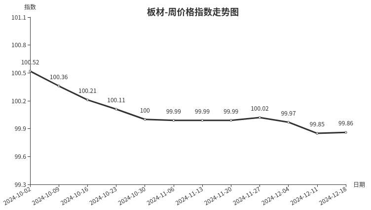 本周,板材类周价格指数收于99.86点,环比上涨0.01点,涨幅0.01%。从指数构成要素看,二级分类中材料板材周价格指数环比上涨0.01点,涨幅0.01%;周转板材周价格指数环比持平。