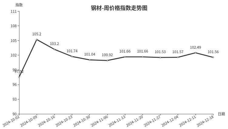 本周,钢材类周价格指数收于101.56点,环比下跌0.93点,跌幅0.91%。从盘面看,三级分类全部出现下跌,其中建筑钢材类、型材类、板材类、管材类指数分别下跌1.41点、1.27点、0.88点、0.72点。