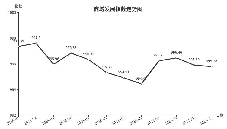 据临沂商城指数系统监测,12月份临沂商城发展指数收于995.78点,环比下跌0.11点,同比下跌1.50点。