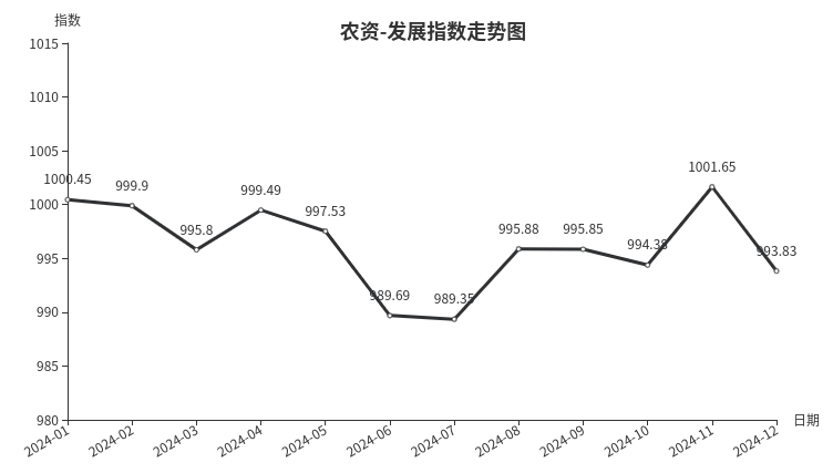 从发展指数构成来看,2024年12月份,发展规模指数收于996.05点,环比下跌0.31点,同比下跌1.10点;发展效益指数收于995.34点,环比下跌0.06点,同比下跌1.47点;发展信心指数收于996.14点,环比上涨0.21点,同比下跌2.33点。